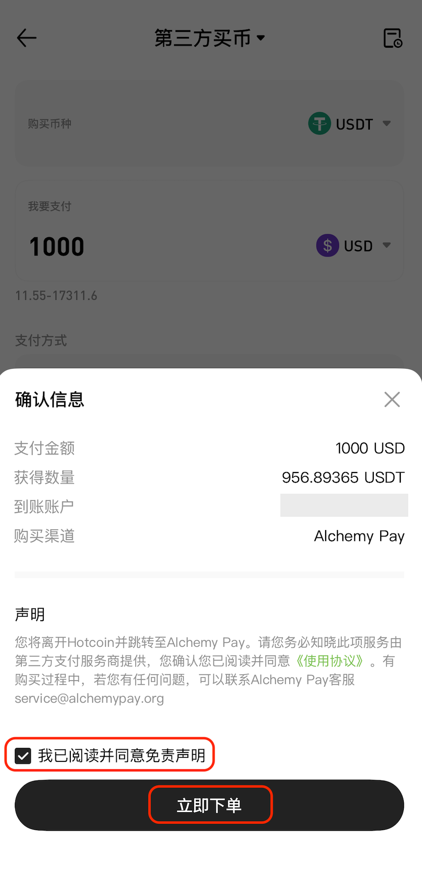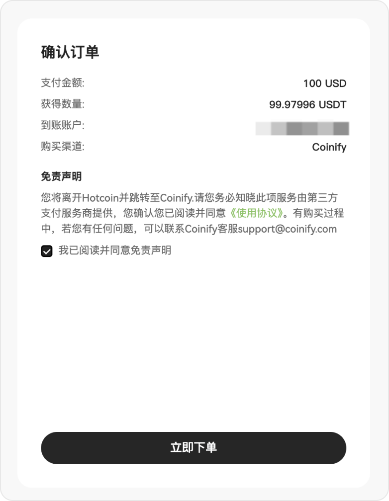 在确认信息弹出页面中,确认订单信息并勾选「我已阅读并同意免责声明」,点击「立即下单」,系统将跳转至第三方平台继续完成购买流程。