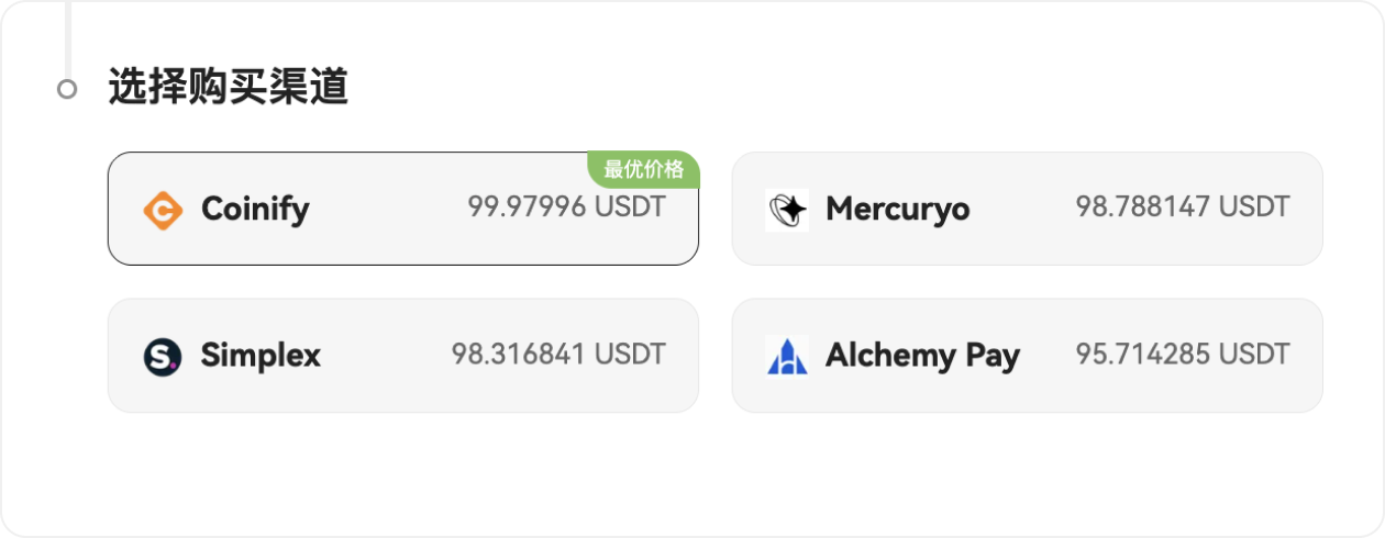 通过 Coinify、Simplex 和 Alchemy Pay,您可以使用多种支付方式便捷购买加密货币,无需繁琐充值,即可快速开启交易体验。