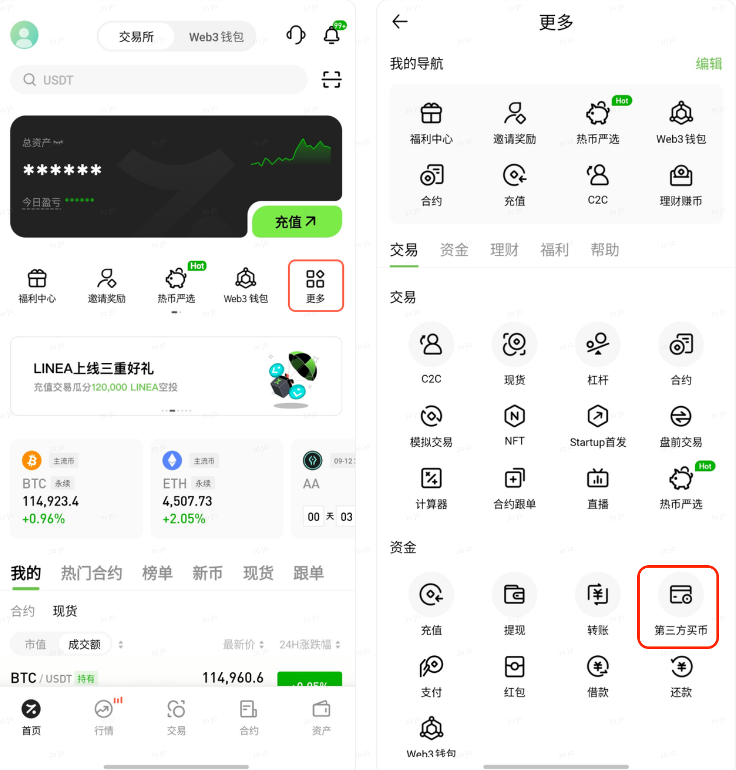 在首页功能区,点击「更多功能」,在资金模块中选择「第三方买币」。