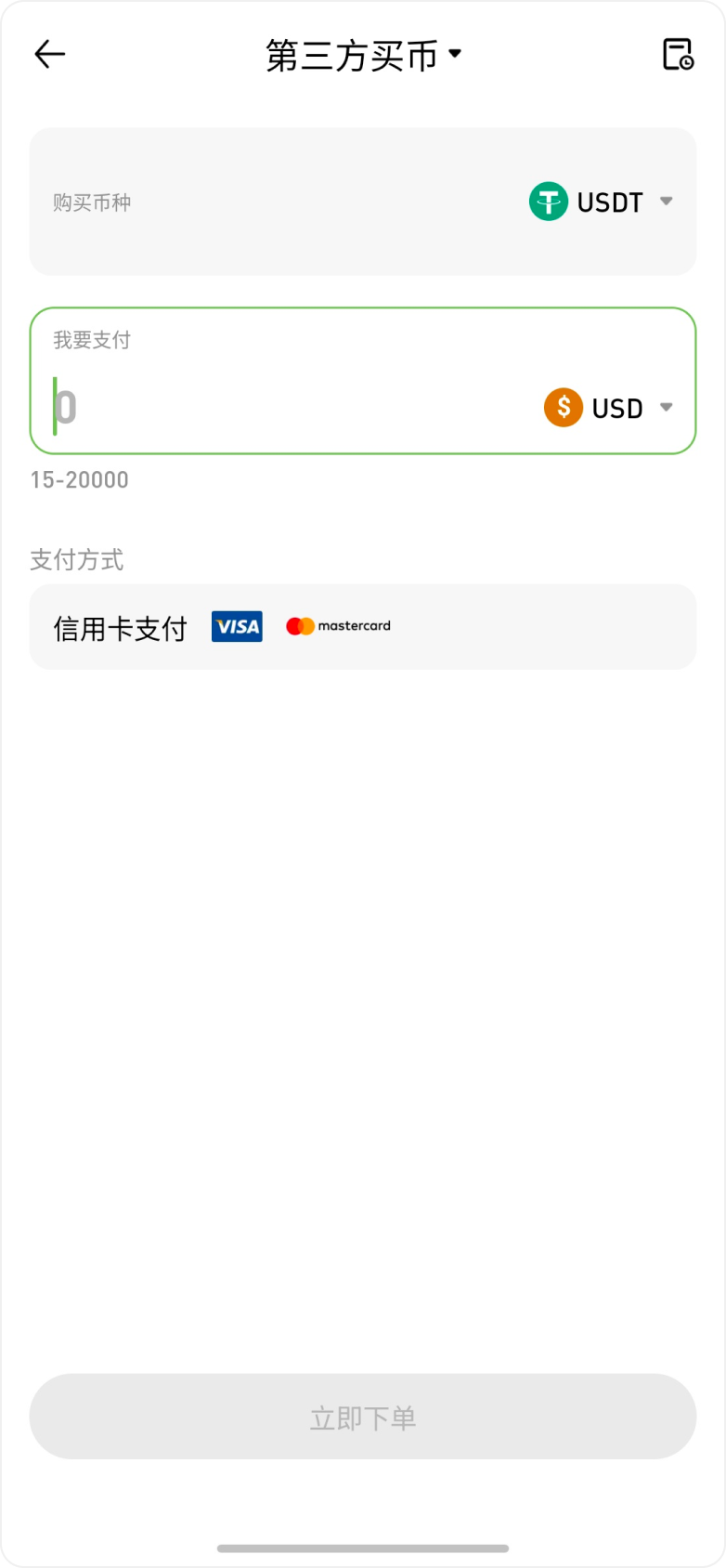 在第三方买币界面,在「支付详情」中选择购买币种,并输入支付的法币及金额。