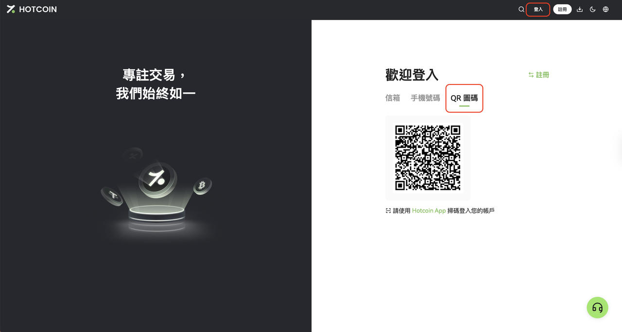 2. 使用電腦瀏覽器前往 Hotcoin 官方網站,進入「登入」頁面,並選擇 「QR Code 」掃碼登入」;