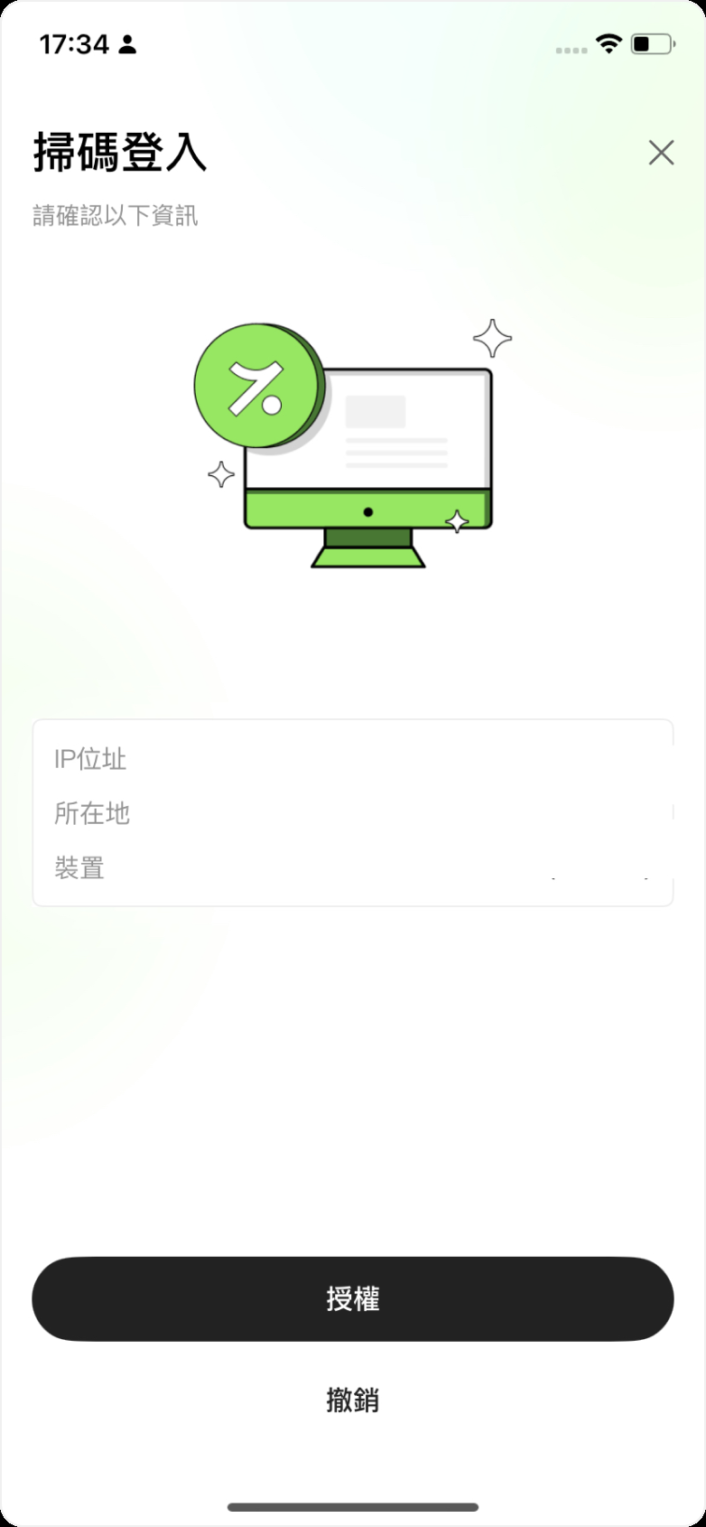 4. 在 App 彈出的確認頁面中查看登入資訊,確認無誤後點擊 「授權」;