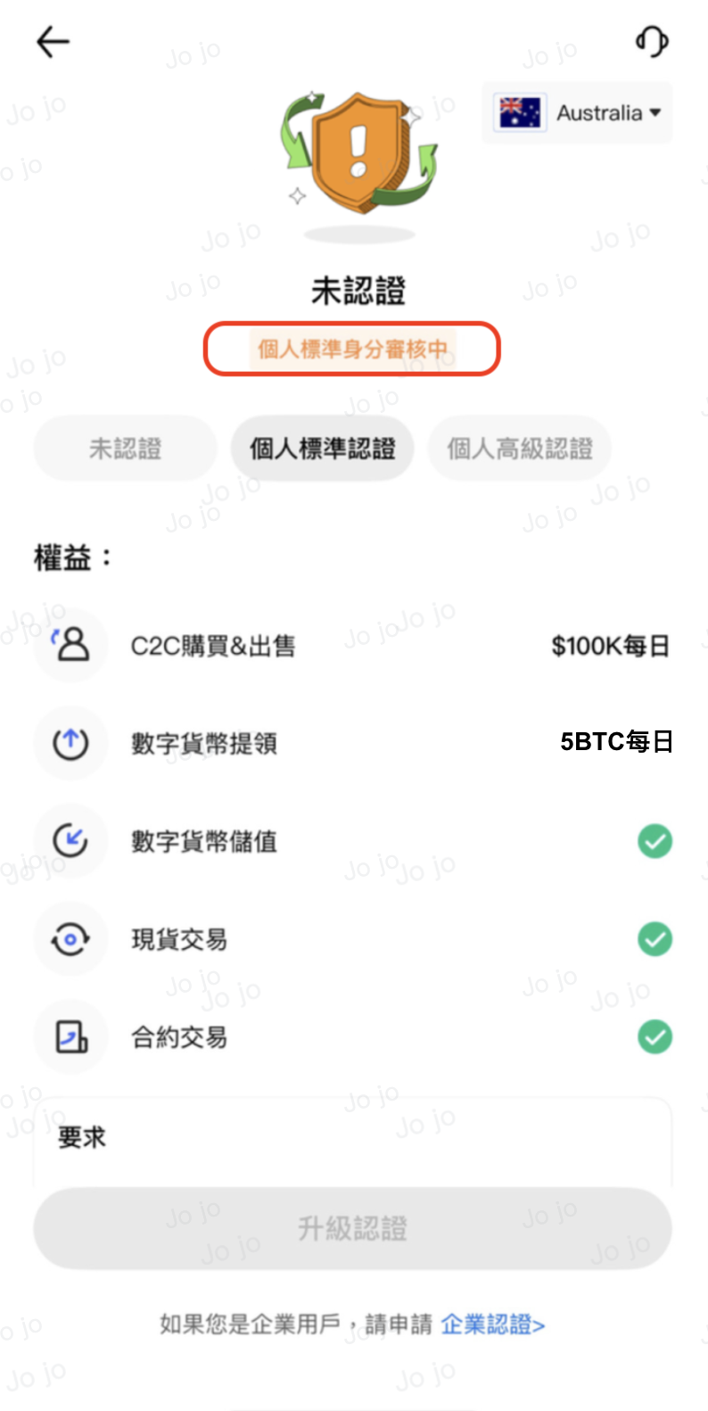提交認證申請後,頁面將顯示 「個人標準身份審核中」,請耐心等候系統審核。