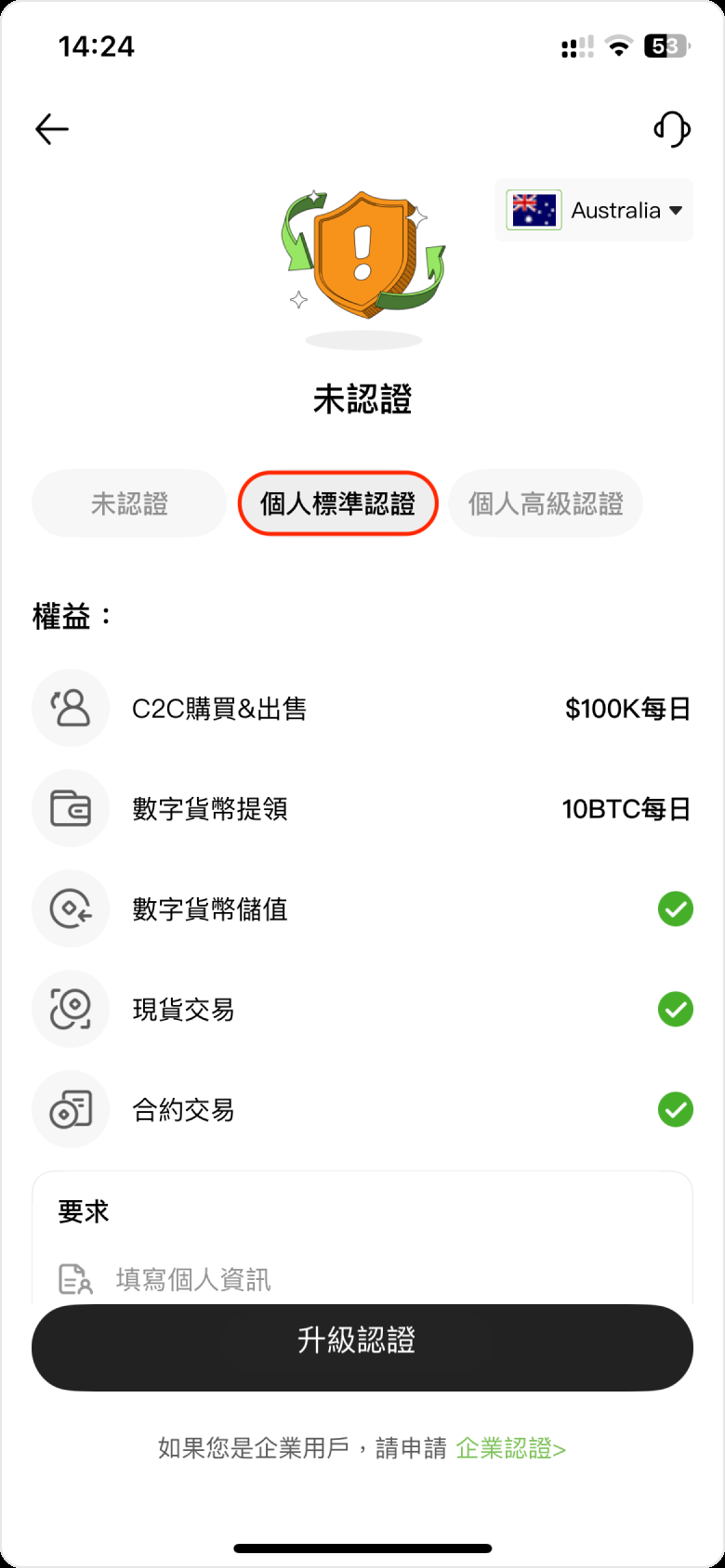 以 「個人標準認證」 為例,點擊頁面下方 「升級認證」。